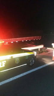 Os Policiais encontraram a carreta denunciada já acidentada, fora da pista e sobre o canteiro central